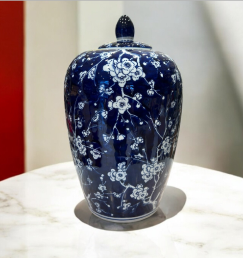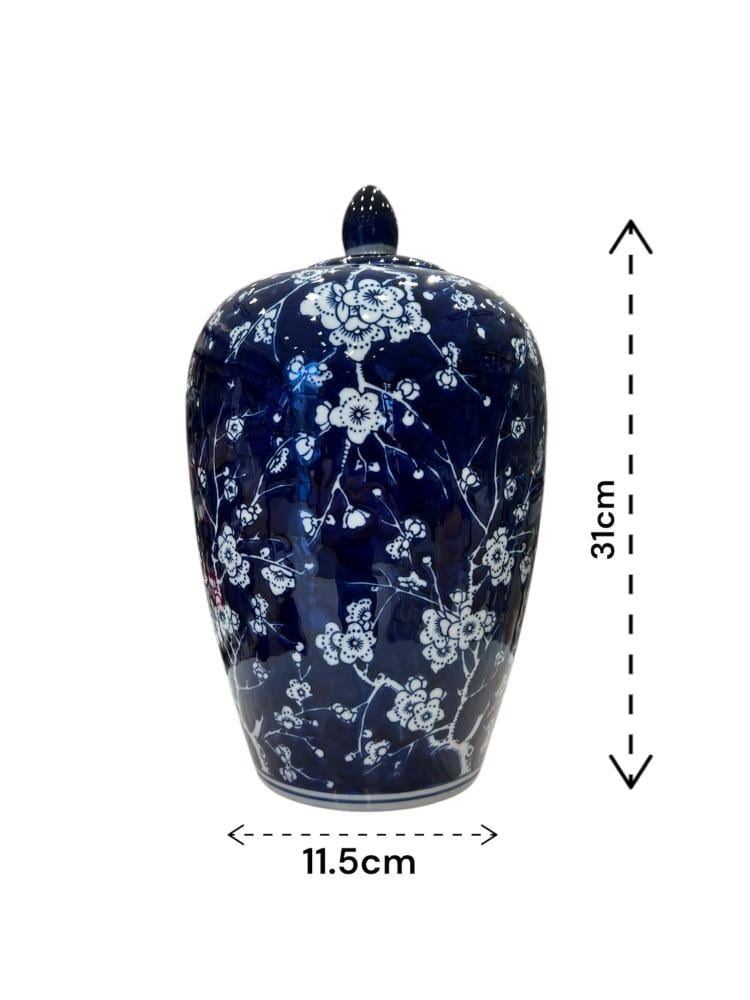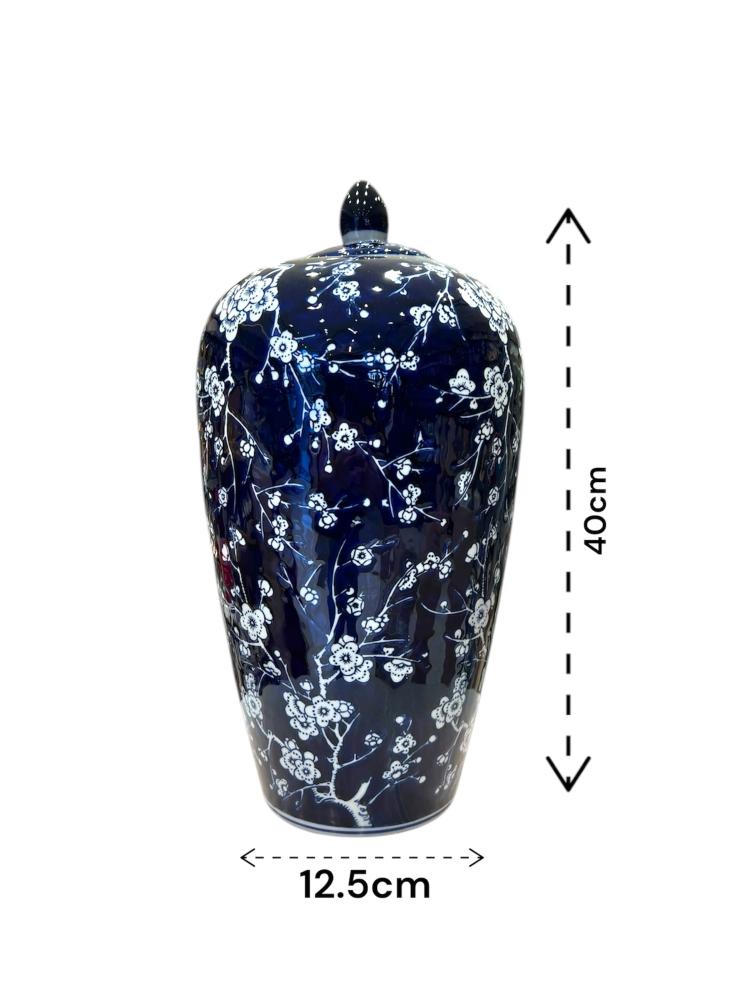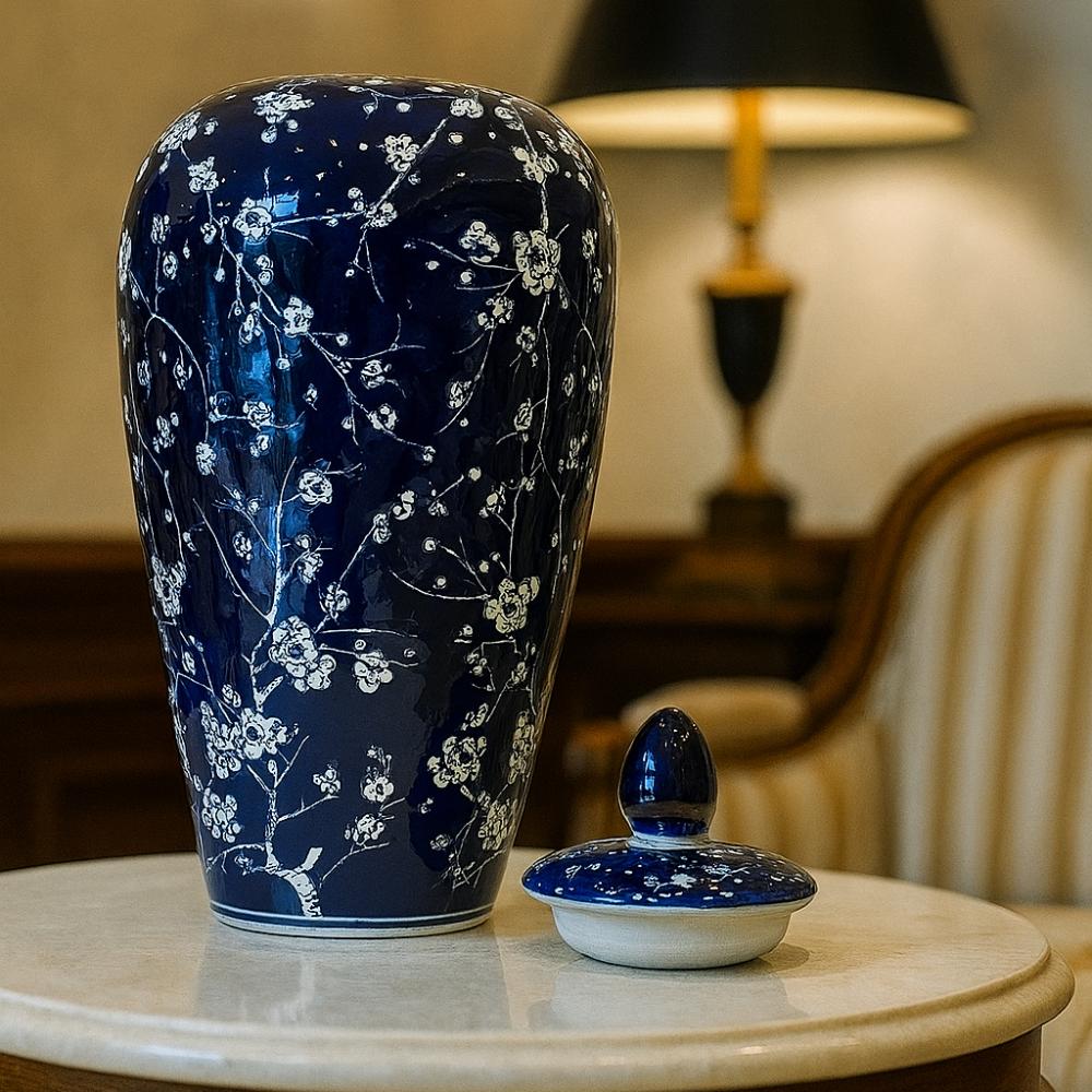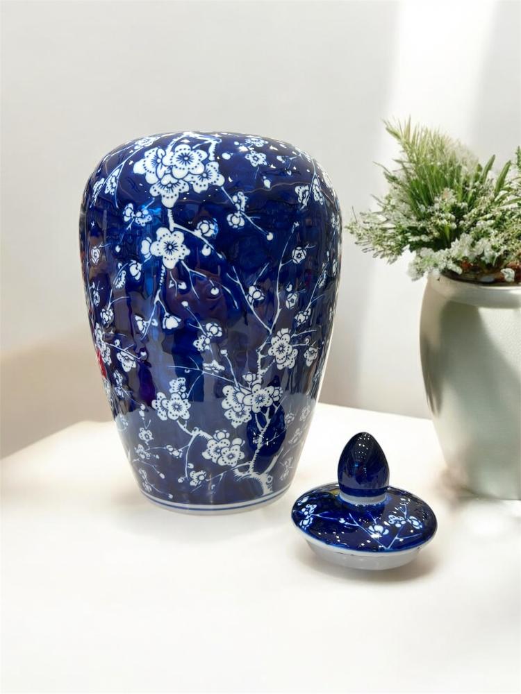 استمتع بإضافة لمسة من الرقي الكلاسيكي إلى منزلك مع هذه الفازة السيراميك الفاخرة، بلونها الأزرق الملكي والنقشة الزهرية البيضاء الأنيقة التي تعكس تفاصيل فنية دقيقة. تأتي الفازة مع غطاء أنيق يزيد من فخامتها، ومتوفرة بحجمين