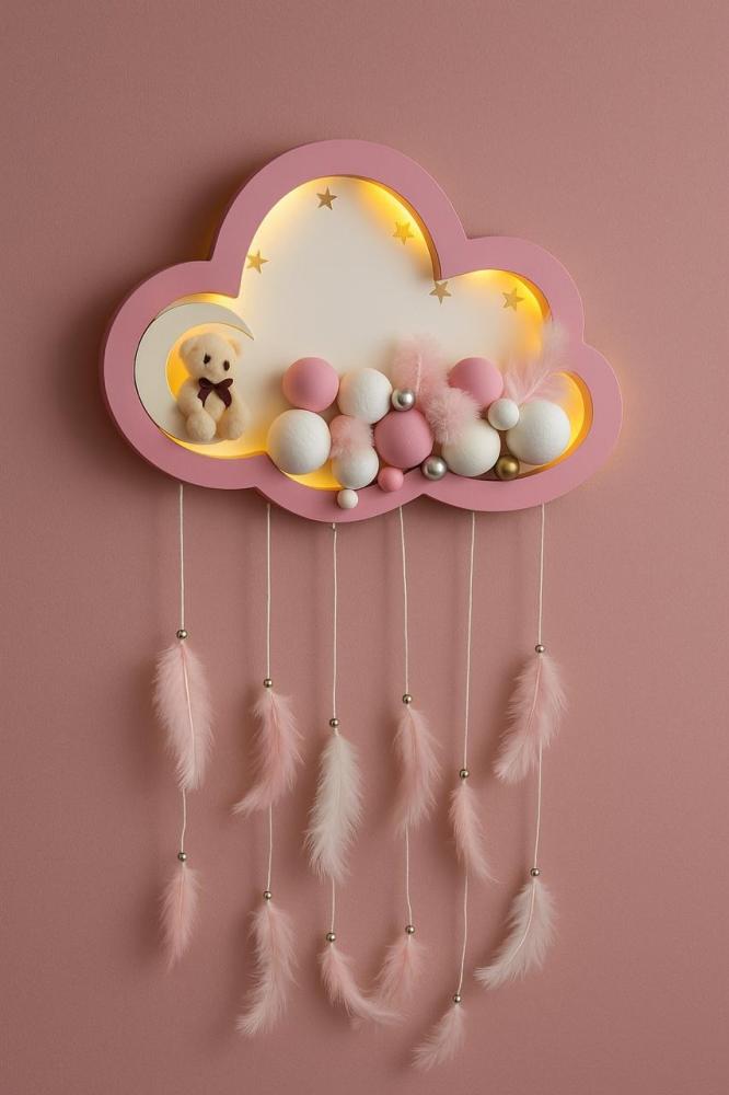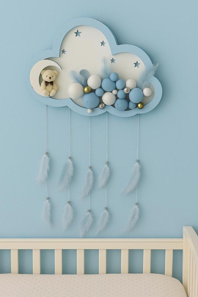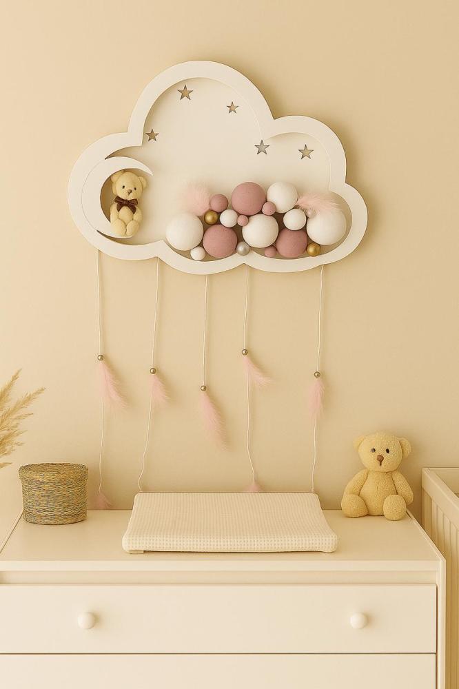 حوّلي غرفة طفلك إلى عالم من الخيال مع تعليقة غيمة الأحلام، بتصميم ساحر على شكل غيمة مزينة بنجوم، وكرات ناعمة بألوان دافئة ودمية دب صغيرة تضيف لمسة حب وحنان